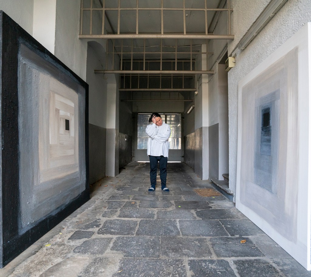 „Zwischen Asche und Kohle“ ist eine Arbeit, die eine philosophische Struktur materialisiert – sie umfasst den natürlichen Fluss, die Schwerkraft der Stoffe, das Zusammenspiel der Materialien und sogar den Blick der Betrachtenden. Ich platzierte eine Spiegelfolie in der Mitte der Leinwand und ließ Gemische aus Asche + Latex sowie Kohle + Latex ohne Pinsel auftragen, allein dem Fluss der Schwerkraft überlassen. Diese Linien durchkreuzen sich, fließen über die Oberfläche, und ihre Spuren füllen die Leinwand.
