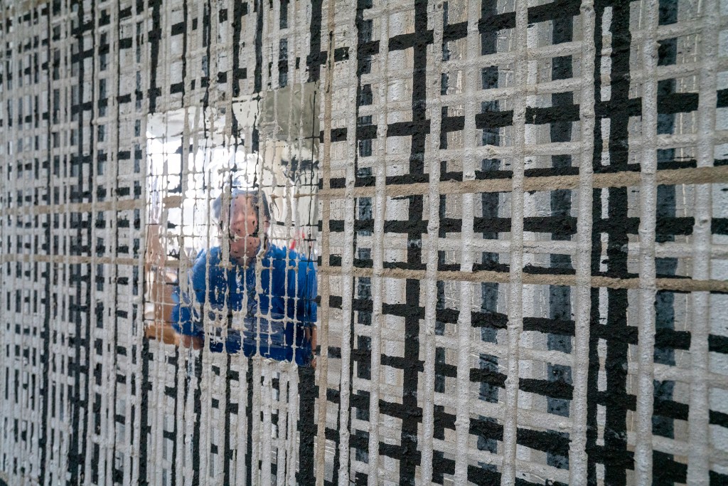 Die zwischen Asche und Kohle entstandenen Werke bestehen aus unzähligen Linien – einige bilden geordnete Schichten, andere wirken chaotischer –, die Schicht für Schicht übereinandergelagert werden. Durch Spiegel, die zwischen diesen wiederholten Linien aus Asche und Kohle eingebettet sind, wird der Betrachter eingeladen, etwas jenseits des Sichtbaren wahrzunehmen und einen Raum zwischen Präsenz und Reflexion zu erkunden.