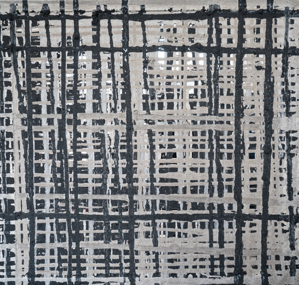 Die zwischen Asche und Kohle entstandenen Werke bestehen aus unzähligen Linien – einige bilden geordnete Schichten, andere wirken chaotischer –, die Schicht für Schicht übereinandergelagert werden. Durch Spiegel, die zwischen diesen wiederholten Linien aus Asche und Kohle eingebettet sind, wird der Betrachter eingeladen, etwas jenseits des Sichtbaren wahrzunehmen und einen Raum zwischen Präsenz und Reflexion zu erkunden.